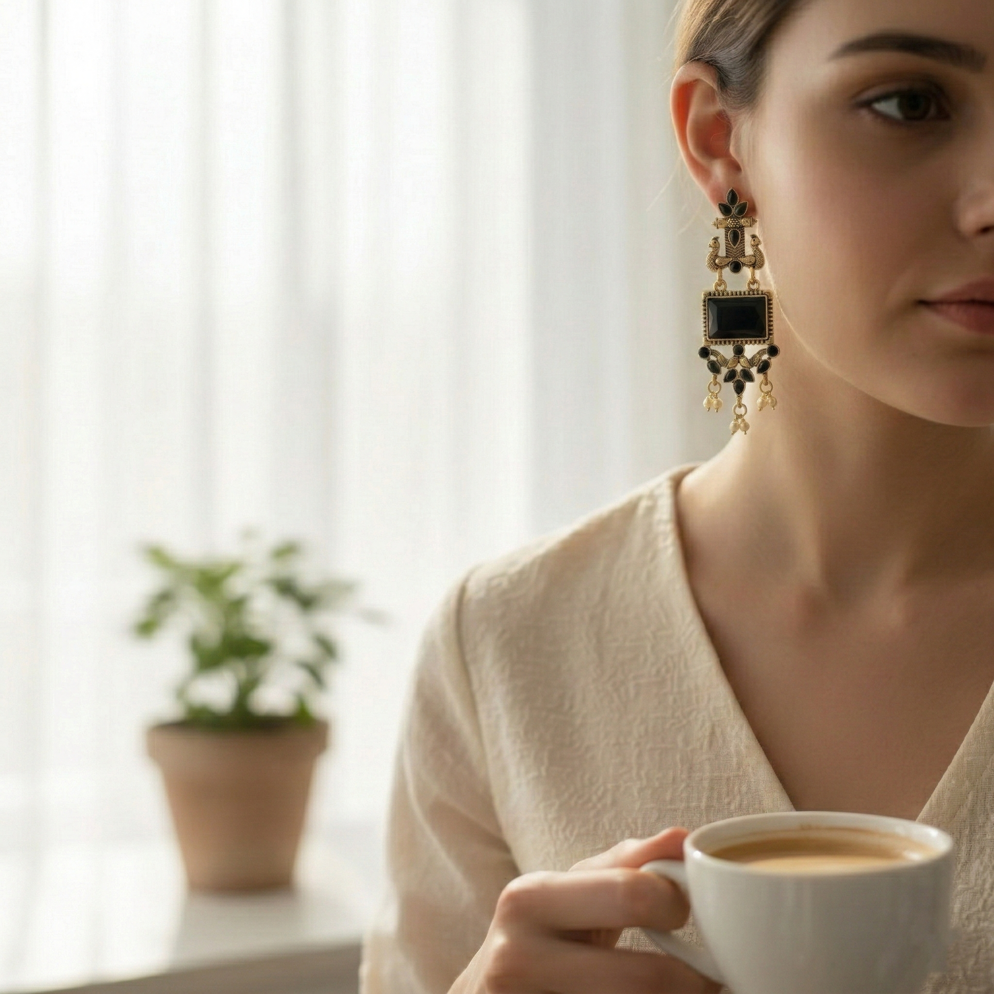 Make a grand statement this festive season with these Black Stone Antique Gold Plated Peacock Earrings π¦. Designed with intricate peacock craftsmanship and a bold rectangular black stone centerpiece, these traditional dangler jhumki earrings reflect timeless heritage with a modern royal touch.