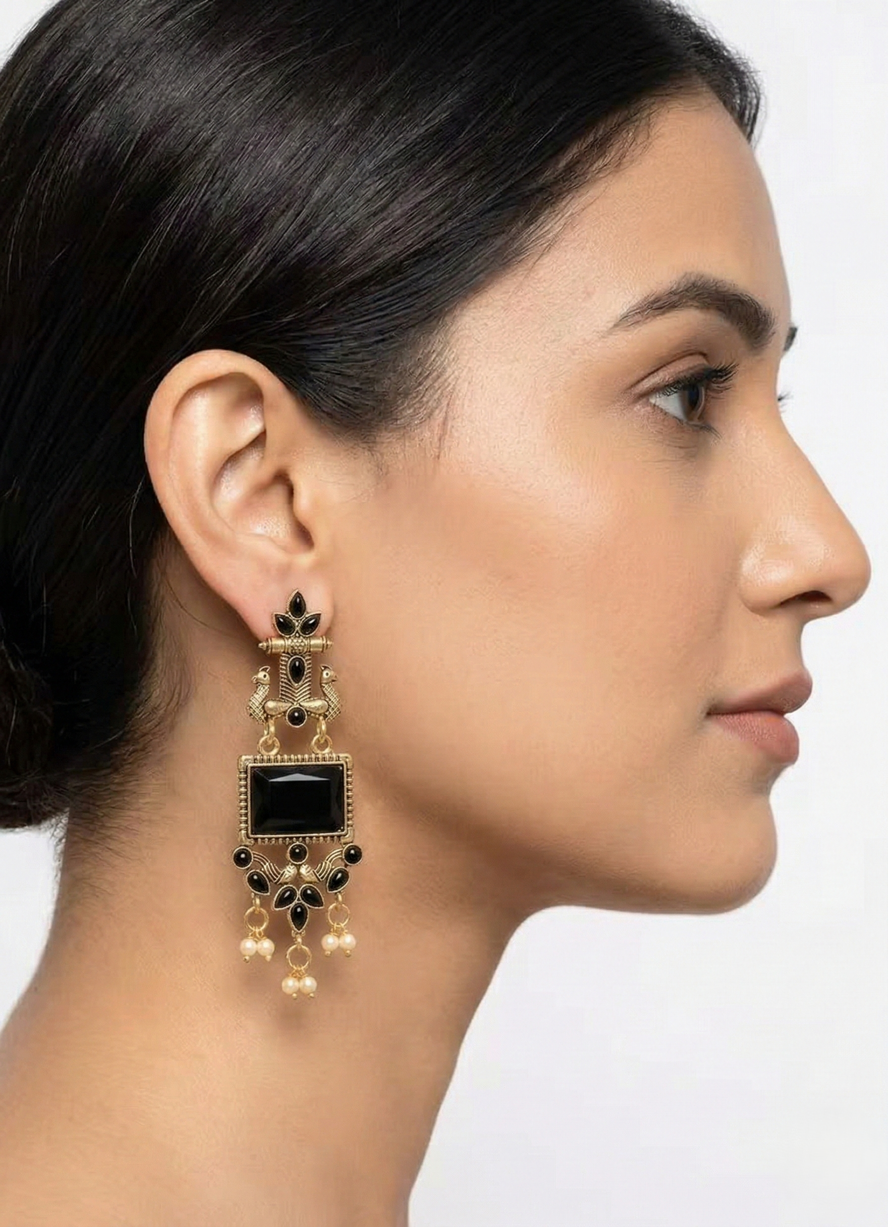 The antique oxidised gold finish enhances the vintage charm, while the deep black stones add a dramatic elegance that pairs beautifully with sarees, lehengas, salwar suits, and festive gowns π«. Finished with delicate pearl drops, these earrings create graceful movement and eye-catching sparkle with every step.