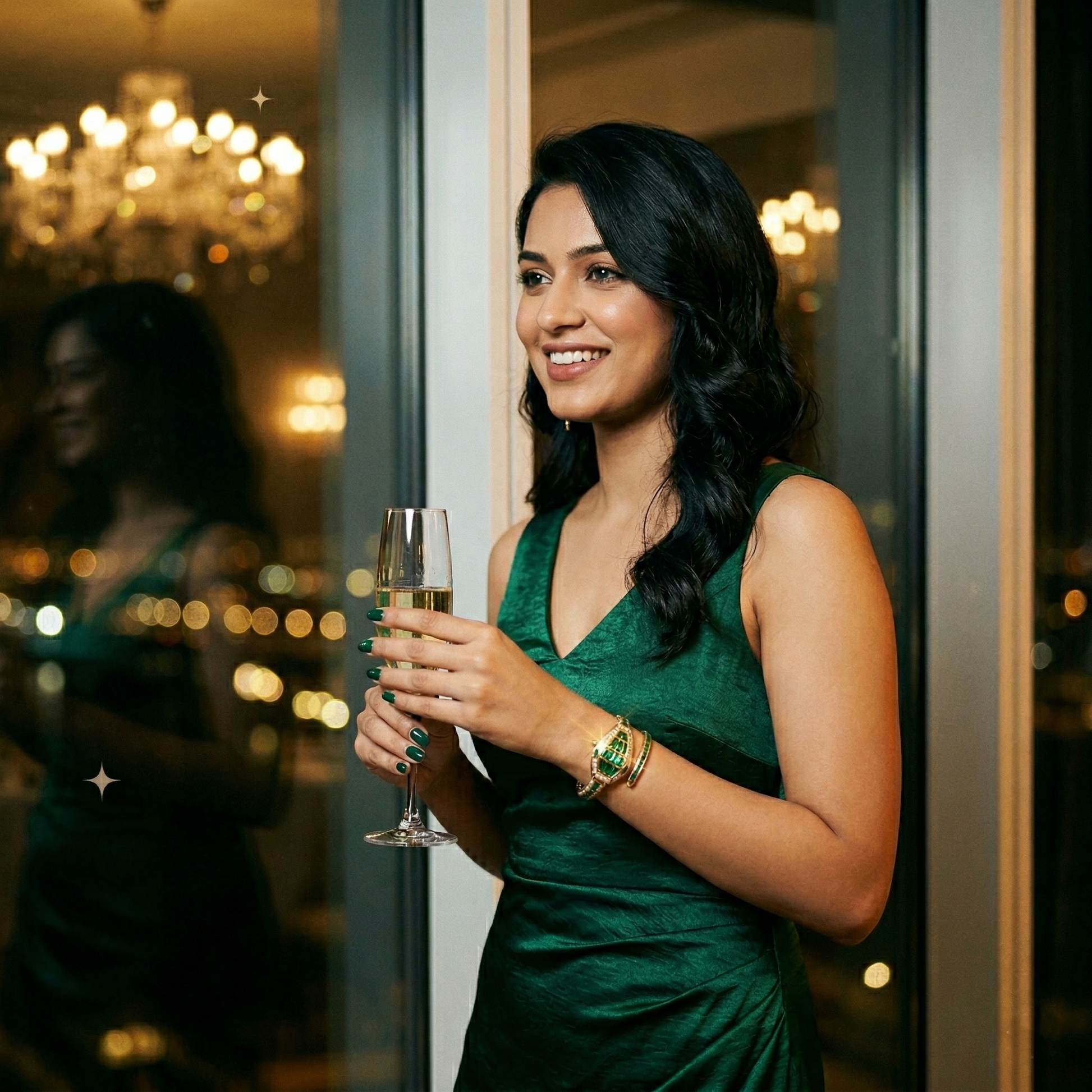• Emerald‑cut green baguette crystals and diamond‑like accents add sparkle