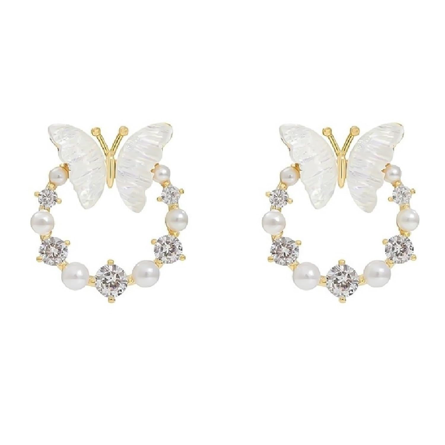 These exquisite butterfly earrings are a charming addition to any jewelry collection, designed for women and girls who appreciate delicate fashion accessories. Each gold-toned stud earring features a graceful iridescent butterfly motif, complemented by a circular arrangement of lustrous white pearls and sparkling cubic zirconia stones. The intricate craftsmanship creates a captivating look, making these pearl stud earrings suitable for both everyday wear and special occasions. This pair of butterfly pearl earrings offers a subtle elegance, perfect for enhancing various outfits and adding a touch of sophisticated charm to your ensemble.