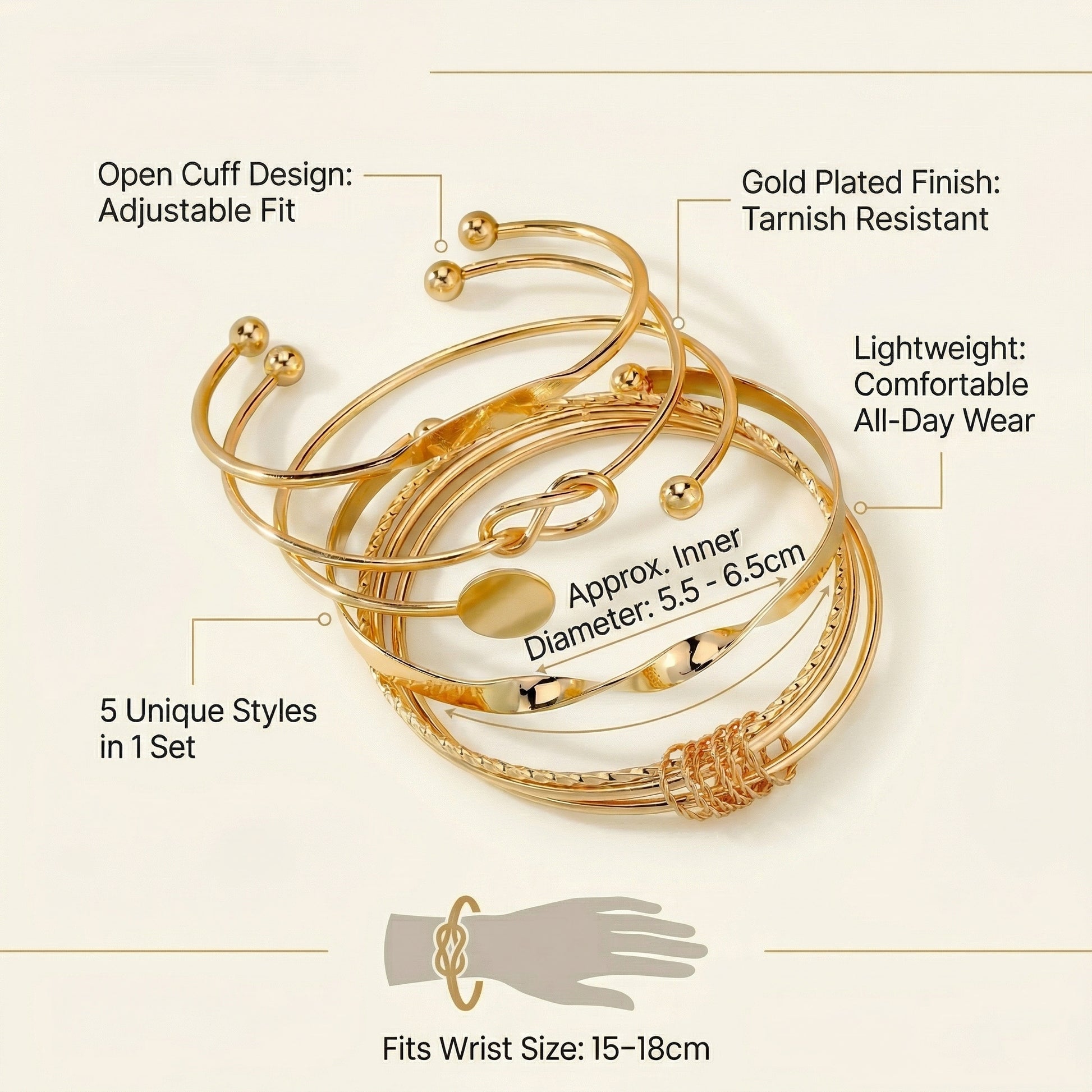 • ADJUSTABLE OPEN CUFF STYLE: Designed with an open cuff construction, these bangles offer a flexible fit for a wide range of wrist sizes, ensuring comfort and preventing constriction, making them suitable for all-day wear.