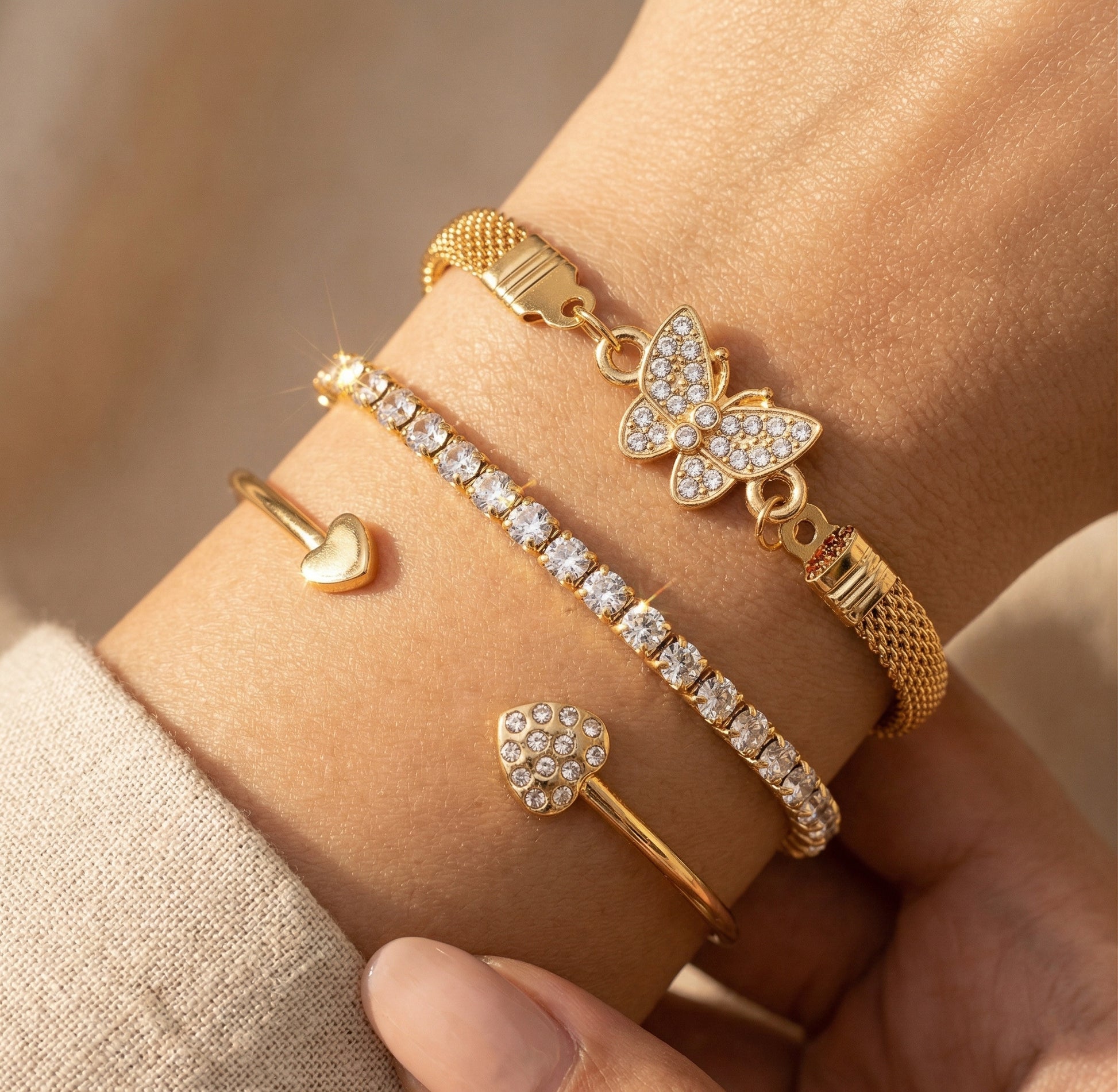 This stunning bracelet set features a layered design with a delicate mesh chain, a sparkling butterfly charm, and adorable heart accents, crafted with a radiant gold plating. The intricate detailing and shimmering crystals make this bracelet a versatile accessory, perfect for adding a touch of elegance to your everyday look or complementing your party attire. The adjustable chain ensures a comfortable fit for most wrist sizes, while the secure clasp keeps the bracelet securely in place. This bracelet set is an ideal gifting option for birthdays, anniversaries, or any special occasion, offering a beautiful and thoughtful present for the women in your life. The high-quality plating ensures long-lasting shine and durability, resisting tarnishing and maintaining its beauty over time. It’s a beautiful addition to any jewelry collection, offering a blend of sophistication and playful charm.