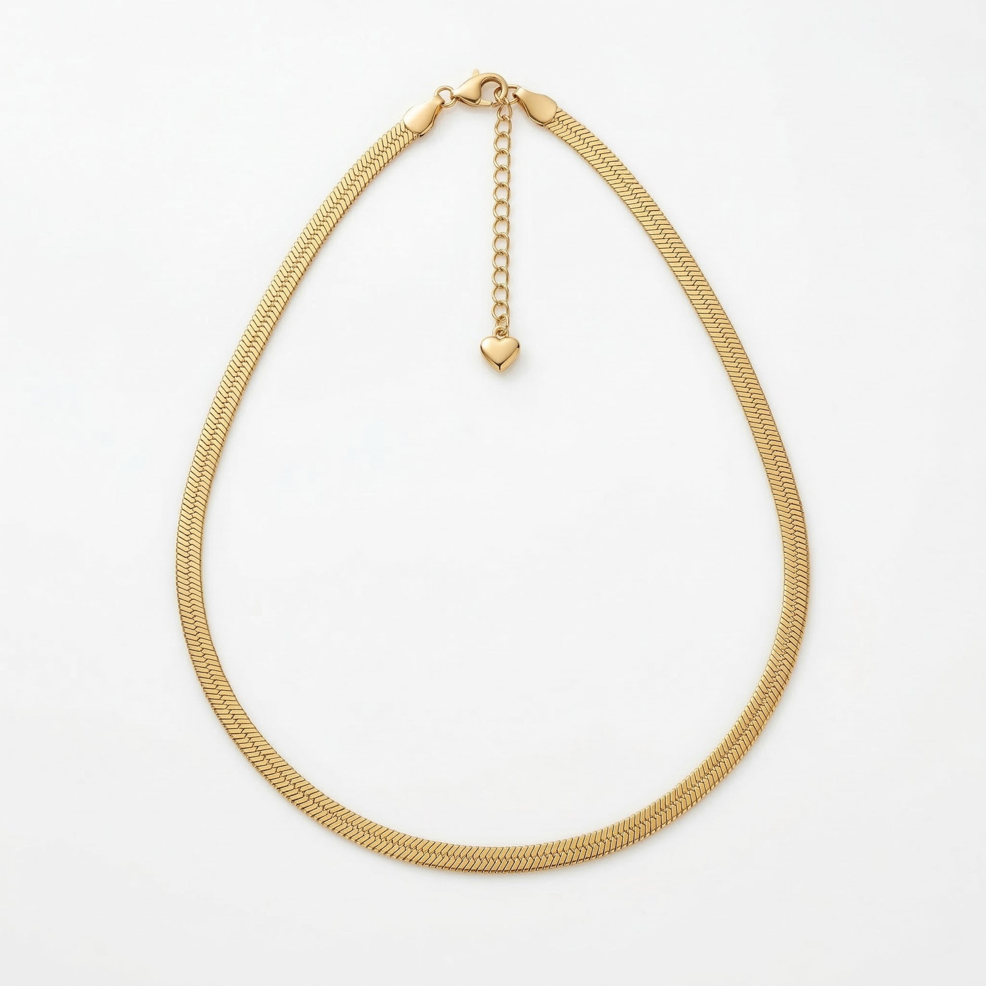 This elegant gold snake chain necklace features a distinctive herringbone weave texture, designed to lie flat and smooth against the skin for a comfortable fit. Crafted with a lustrous gold tone finish, this flat chain choker is a versatile accessory suitable for women and girls. It comes equipped with a secure lobster clasp and an adjustable extender chain, adorned with a delicate heart charm, allowing for a customizable length. This gold tone necklace is an ideal choice for daily wear, adding a touch of sophistication to office attire, or enhancing your look for party wear, festive occasions, and special events. Its sleek design makes it a staple piece of fashion jewelry for modern wardrobes.