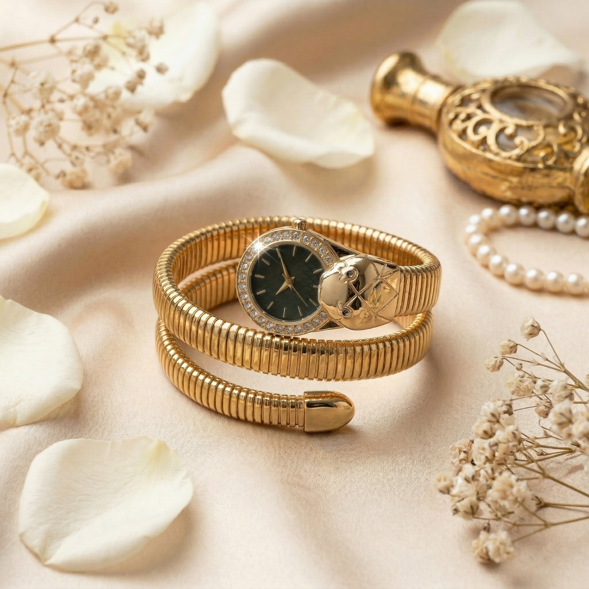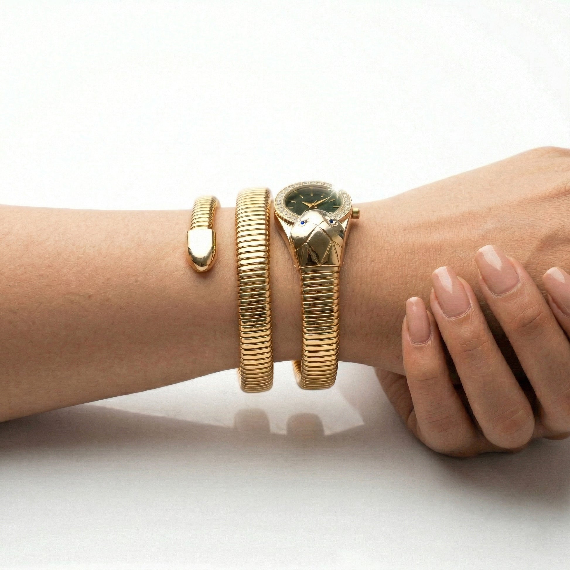 • GOLD SERPENTI DESIGN: This watch features a serpent-shaped bangle with a crocodile head, made in gold, offering a unique and elegant look that blends ethnic charm with modern fashion for women.