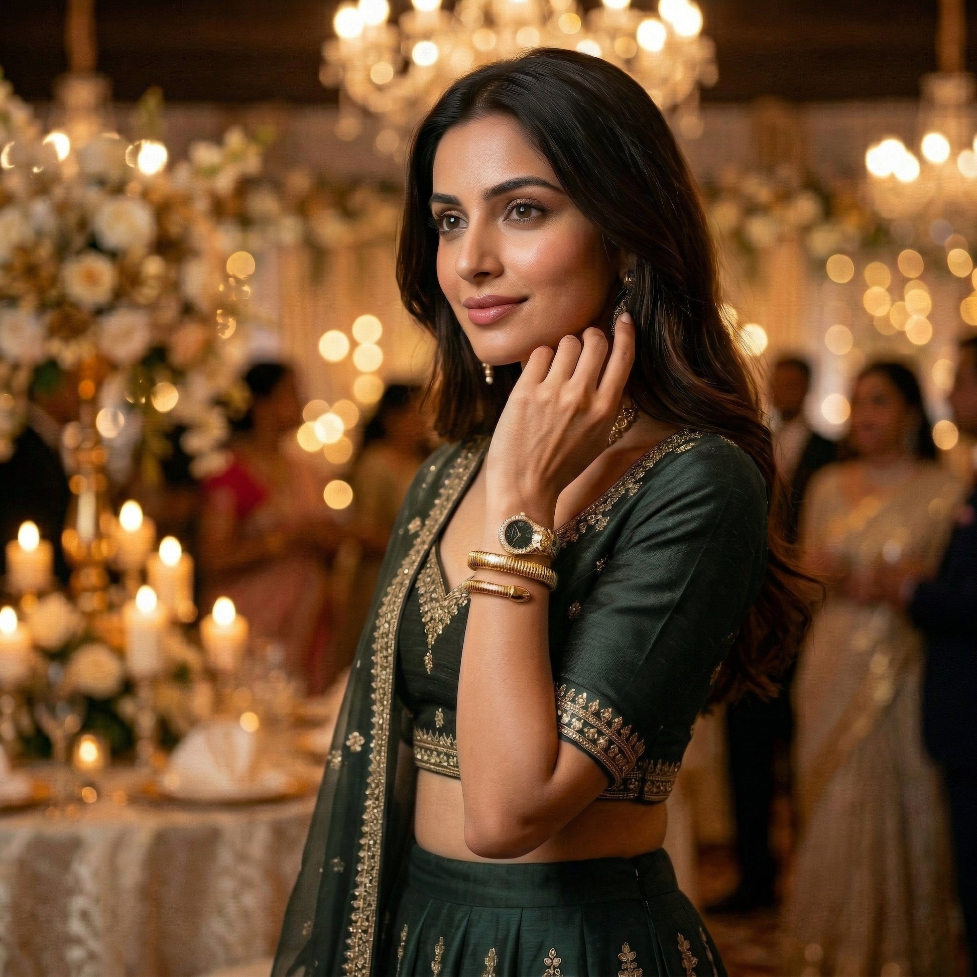 • DIAMOND-STUDDED BEZEL: The watch face is surrounded by a bezel studded with diamonds, adding a luxurious touch and making it suitable for wearing at weddings, parties, and other formal events.