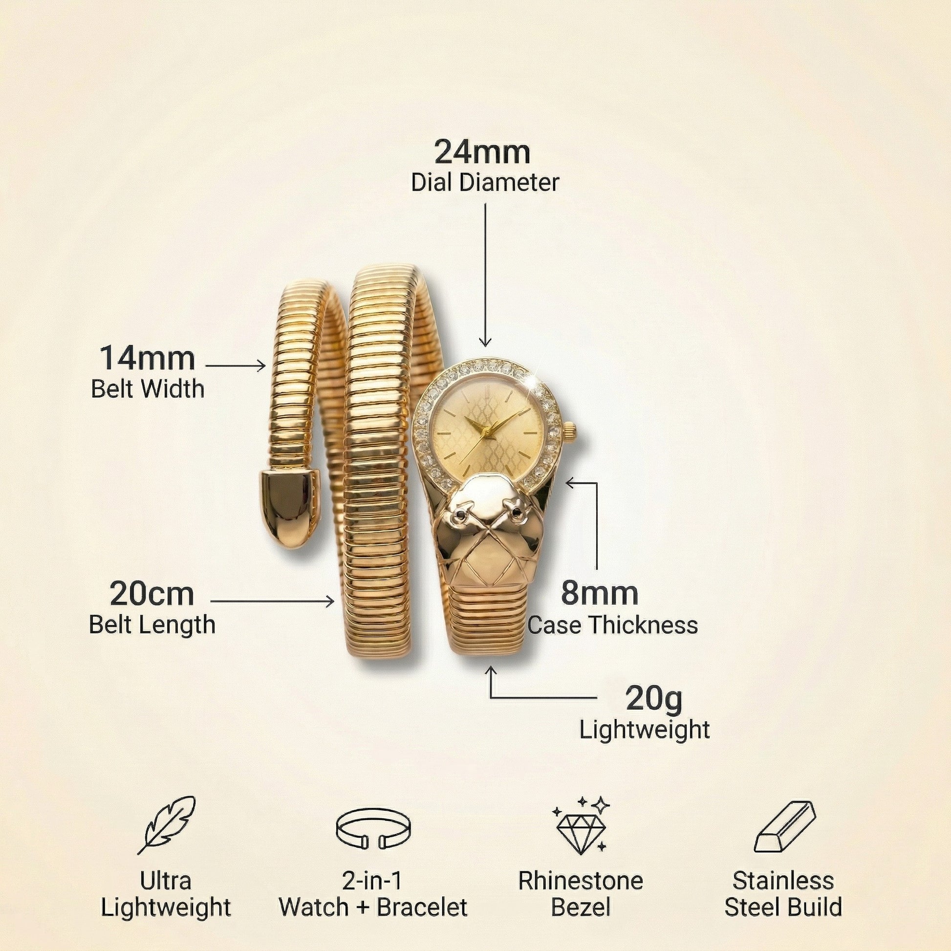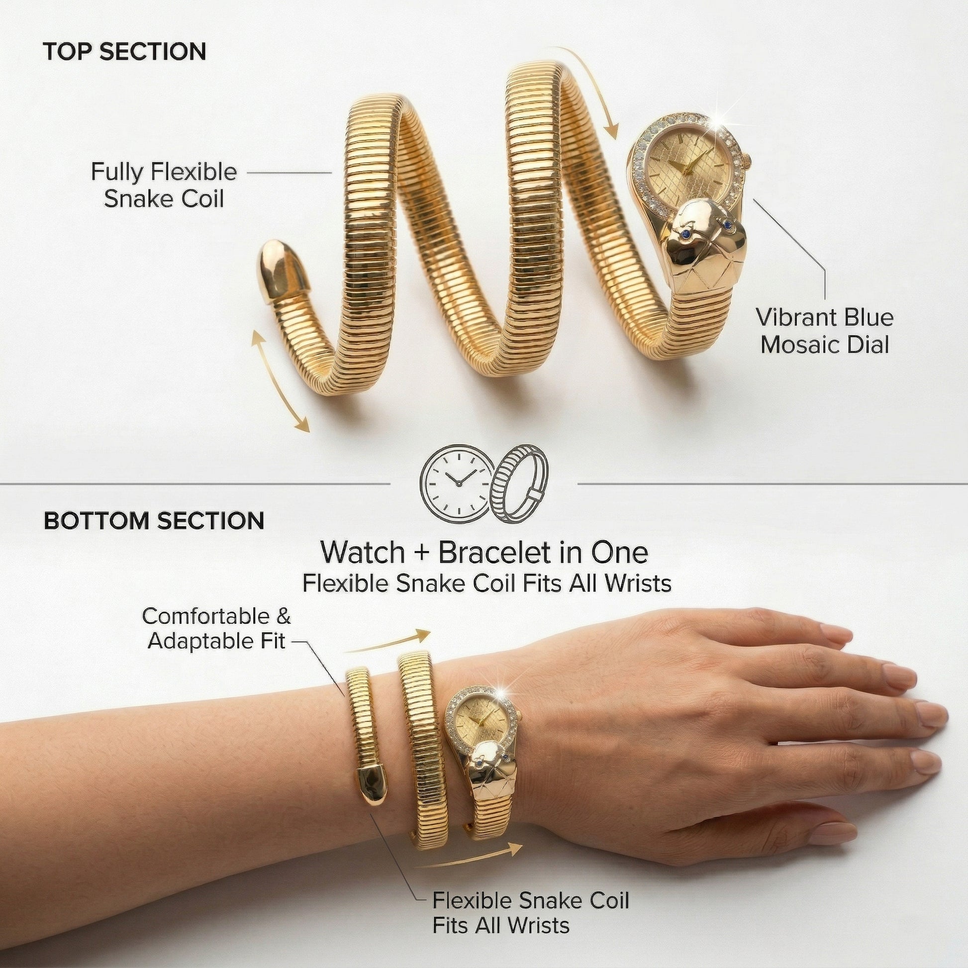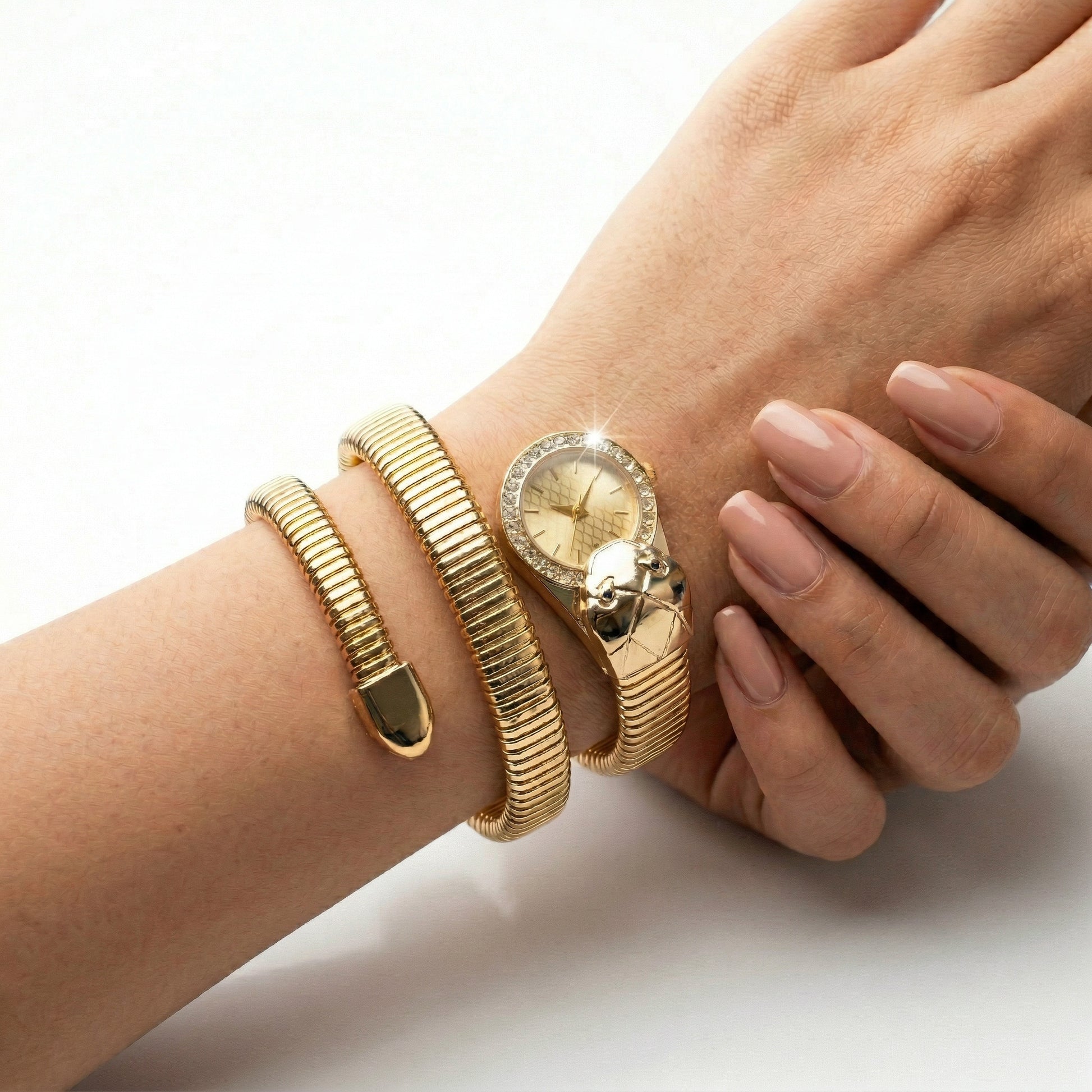 • GOLD SERPENTI DESIGN: This watch features a serpent-shaped bangle with a crocodile head, made in gold, offering a unique and elegant look that blends ethnic charm with modern fashion for women.