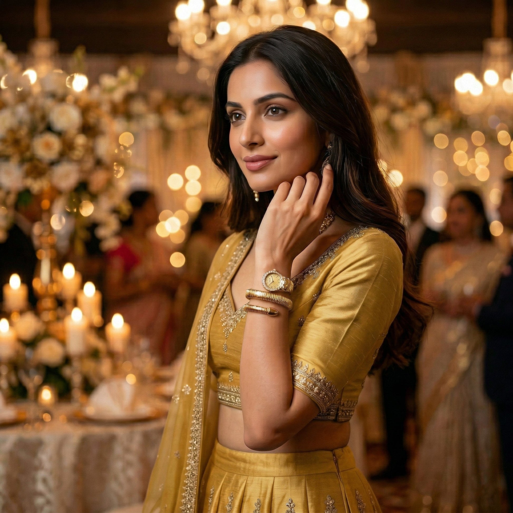 • DIAMOND-STUDDED BEZEL: The watch face is surrounded by a bezel studded with diamonds, adding a luxurious touch and making it suitable for wearing at weddings, parties, and other formal events.
